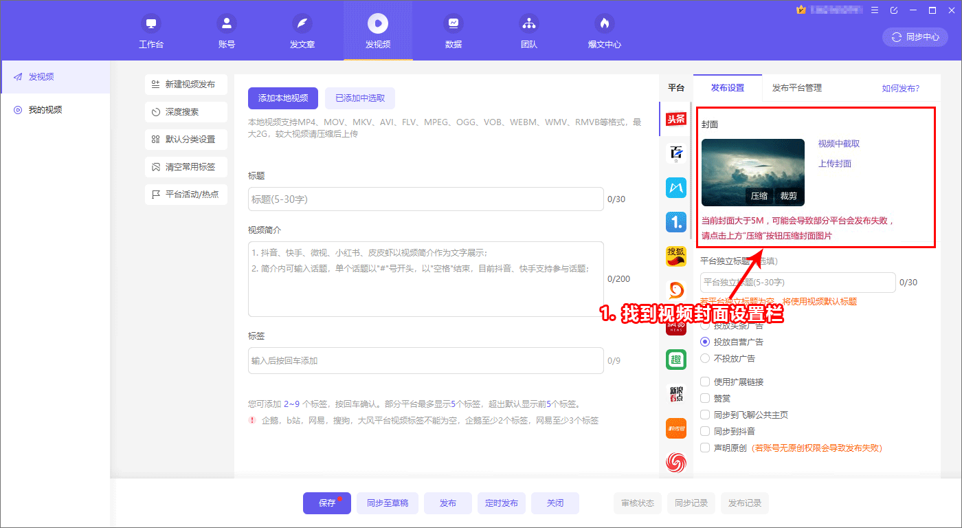 瑙e喅鏂規硶濡備笅錛氬湪銆愯棰戝彂甯冦戠晫闈腑鍙充晶銆愬鉤鍙拌緗戦」涓壘鍒般愬皝闈㈣緗戞爮錛屾牴鎹彁紺虹偣鍑匯愬帇緙┿戞寜閽紝鍘嬬緝銆愬皝闈㈠浘鐗囥戣嚦銆?M浠ヤ笅銆戝嵆鍙紱