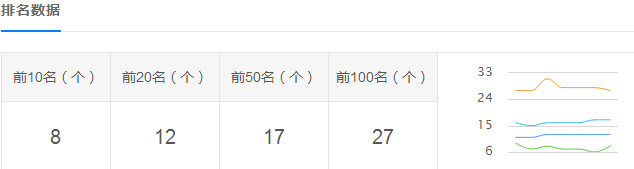 這個統計的是本站有指數的關鍵詞前100名排名情況。由此可見網站的關鍵詞數量還是不少的,雖然客戶只做了三個關鍵詞,但是整站優化帶來的效益是很明顯的。