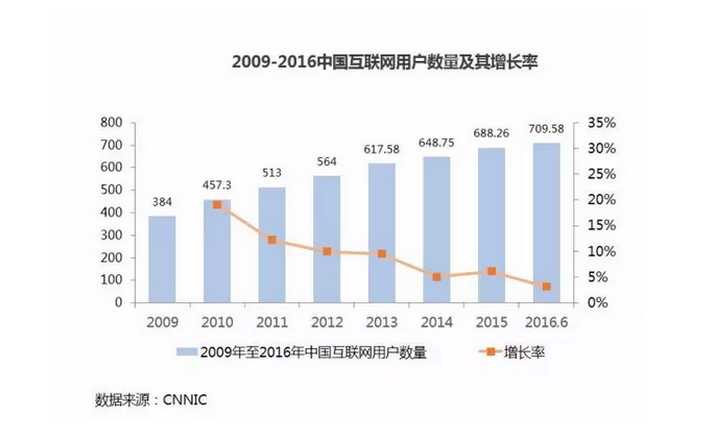 互聯網行業在推動供給側改革創新與居民消費升級中扮演的角色越來越重要。但是,互聯網在經歷五年高速發展后在 2016 年進入了深水區,互聯網用戶增長率明顯放緩,中國遇到網民紅利危機。